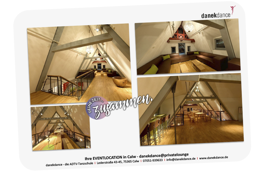 Du willst Deinen Geburtstag, ein Abschlussfest oder eine andere Party feiern? Du willst eine coole Eventlocation, den DJ und die passenden Beats gleich dabei und zum Chillen Deinen privaten Bereich? Und das Ganze ohne das Sparschwein über die Maßen hinaus plündern zu müssen? Dann ist die privatelounge@danekdance genau Dein Ding (= Galerie mit Lounge bei danekdance). Wir machen Dein Event zu einem besonderen Erlebnis. Du und Deine Gäste stehen dabei ganz im Mittelpunkt, denn die privatelounge@danekdance steht Euch zur Verfügung.